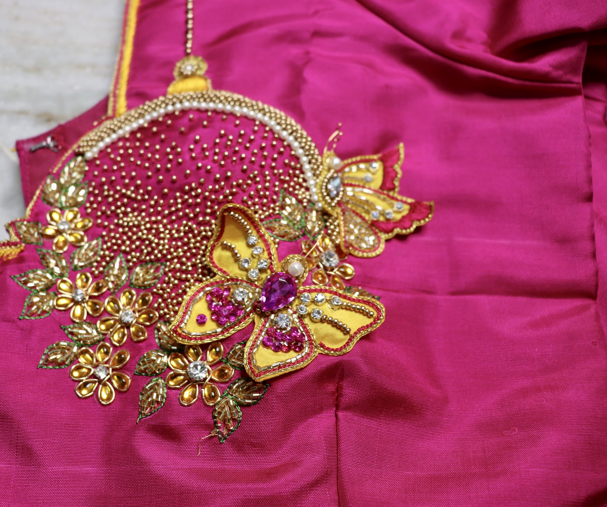 Unique Designers Theni 3d Butterfly Embroidery - The basic process used is where gemstones and pearls are studded on it after completing the zardozi embroidery using gold and silver threads.